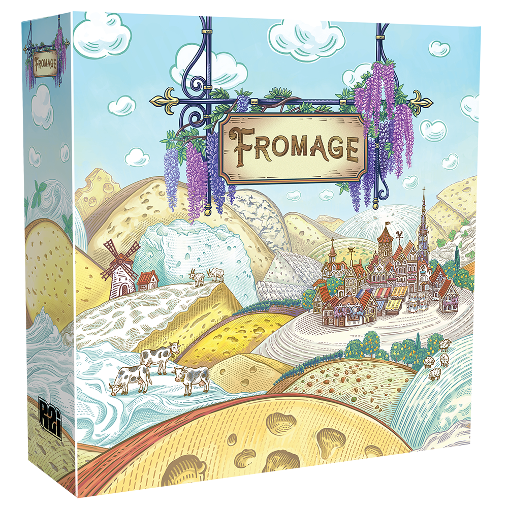 Fromage is a simultaneous worker placement game in which players place workers to make cheese and collect resources from the quadrant of the board in front of them. Once all players have placed their workers, the board rotates, aging any cheese produced and presenting each player with a new quadrant to place workers in. Earn Prestige Points by selling cheese to the four locations and efficiently managing and upgrading your dairy.