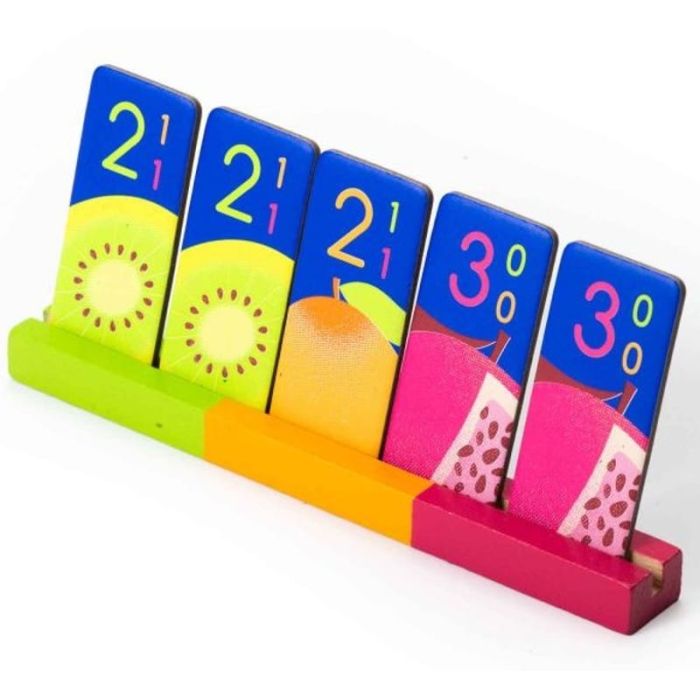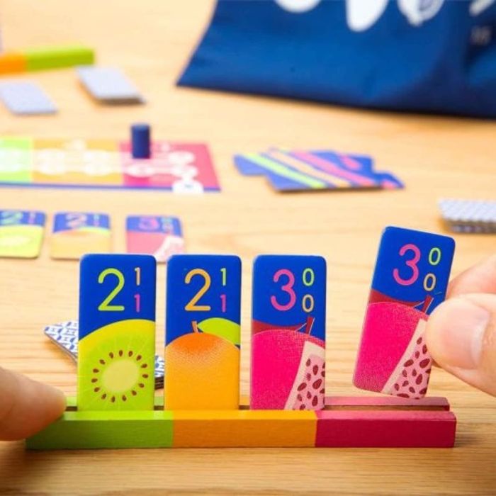 To start the game, each player has a hand of five items: a red plastic cube, a blue wooden key, and so on. Each round, someone flips the top card of the deck, then players race to drop only the correct items from their hand. If you drop something you shouldn't, you're out for the round. If you're the first player to drop everything correctly, congratulations! You'll be rewarded with a bell... which will be placed in your hand and can never be dropped again.