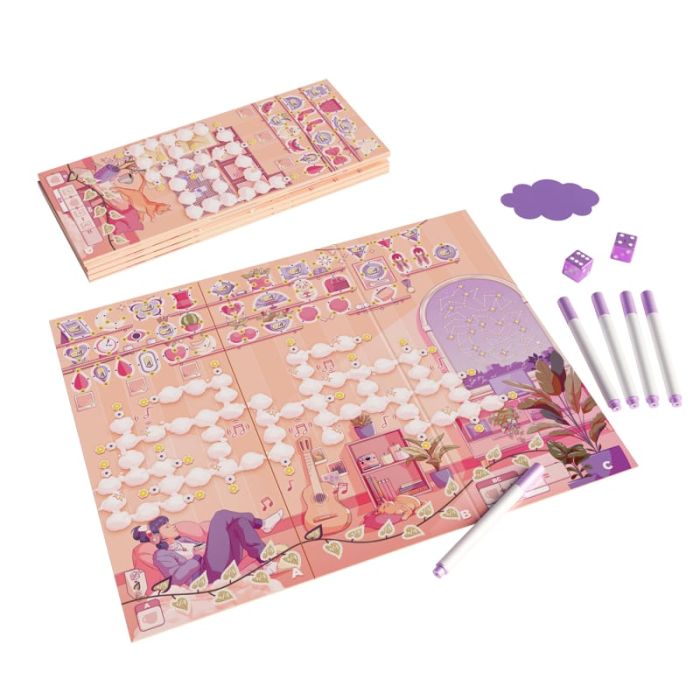 Daydream è un gioco confortevole e ingegnoso che fa bene all’anima! Daydream è un gioco competitivo roll&write, molto “tranquillo” e senza alcuna interazione diretta tra i giocatori, con una grafica rasserenante e rilassante. Tirate i dadi e riempite in contemporanea le vostre griglie di nuvolette con i numeri usciti. Ogni riga deve contenere solo numeri unici , senza ripetizioni: se una riga o una colonna presenta numeri duplicati, quella riga o colonna non varrà nulla . Per ogni riga completata, in base a quanto sarete stati precisi e performanti nell’inserimento dei numeri, riuscirete a “disegnare” alcuni oggetti più o meno velocemente. A fine partita, chi è riuscito a disegnare più oggetti vince!