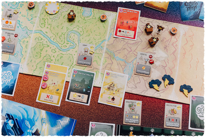 Ogni turno aggiunge una pagina a una storia ricca e divertente che emerge direttamente dal gameplay: sarai tu a decidere se questi mortali vivranno vite prosperose o se dovranno soffrire terribilmente sotto la tua mano divina. Durante il tuo turno, giocherai carte Atto in una delle quattro terre disponibili, influenzando i mortali presenti attraverso la loro creazione, lo spostamento o la manipolazione del loro stato tramite benedizioni e maledizioni. Queste interazioni generano Fede, una risorsa fondamentale poiché, alla fine di ogni round, i mortali celebrano un Festival in ogni terra assegnando Punti Gloria alla divinità che possiede la maggiore influenza. Tuttavia, solo i mortali considerati "Degni" conferiscono gloria, mentre quelli "Indegni" sottraggono punti al tuo totale; dovrai quindi essere abile nel colpirli con i tuoi poteri, allontanarli o benedirli per volgere il loro valore in positivo, cercando al contempo di sabotare le terre in cui i tuoi avversari sono in vantaggio. Poiché i mortali sono una risorsa comune e non appartengono a nessun giocatore, il successo in questo gioco da tavolo risiede nella capacità di manipolare la loro posizione e il loro valore in modo che ti favoriscano al momento del Festival. Ogni divinità dispone di un mazzo di carte Atto unico e di un puzzle strategico asimmetrico e altamente tematico da risolvere, garantendo che ogni sessione sia completamente diversa dalle precedenti.