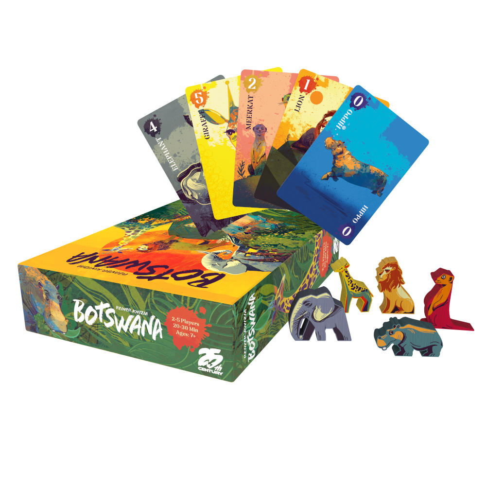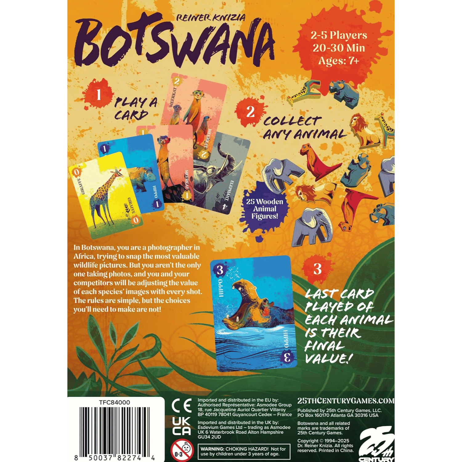 Botswana / Wildlife Safari è stato originariamente pubblicato come Flinke Pinke. Questo gioco è uno di quei giochi "dolorosamente semplici" di Reiner Knizia. Ci sono cinque fiches di colore diverso, con sei carte, da zero a cinque, per ogni colore. Le carte vengono distribuite e i giocatori a turno giocano una carta e prendono una qualsiasi fiche disponibile. Quando un colore ha tutte e sei le carte giocate su di esso, la partita termina e i giocatori usano l'ultima carta giocata in ogni categoria per valutare le proprie fiches. Il valore totale più alto vince.