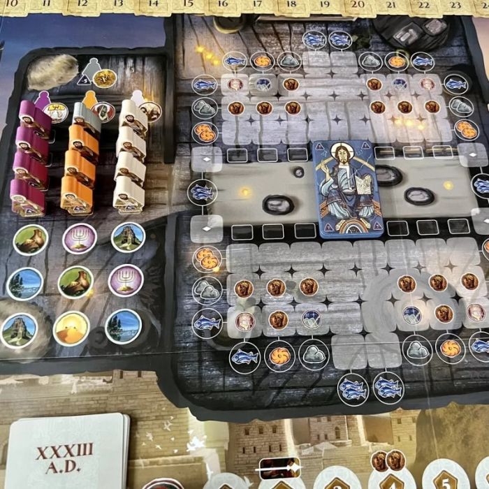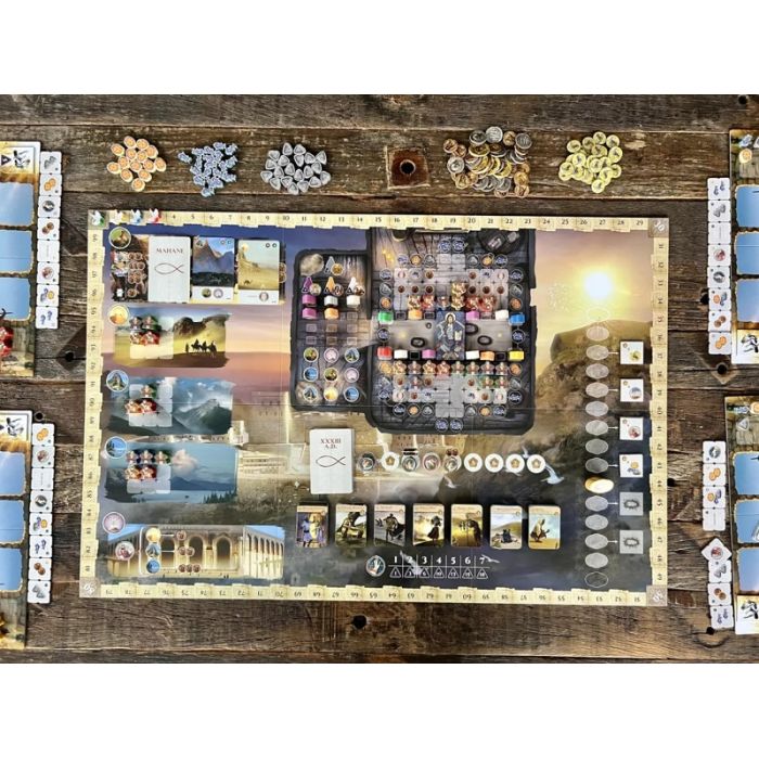 In questo gioco, ogni partecipante rappresenta una comunità di seguaci che giunge in città con un obiettivo ambizioso: avvicinarsi al tavolo dove siedono Gesù e gli apostoli. Più sarai vicino, più onore otterrai.