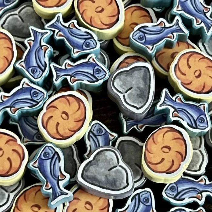 Durante la partita esplorerai luoghi significativi: il mercato, il deserto, la montagna, il lago, il tempio e otterrai risorse come pietre, pane e pesce, oppure denari e carte azione che ti permettono di fare più mosse.