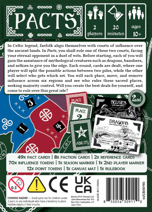 📅 La data di consegna è stimata e potrebbe subire variazioni.Nella leggenda celtica, i faefolk si alleano con le corti che influenzano le terre antiche. I Seelie sono alleati della primavera e della crescita, mentre gli Unseelie sono quelli del freddo e dell'inganno. In Pacts , governerai una di queste due corti, affrontando il tuo eterno avversario in un duello di ingegno. Prima di iniziare, ognuno di voi otterrà l'assistenza di creature mitologiche come draghi, banshee e selkie per darvi un vantaggio. A ogni round, vengono distribuite le carte: un giocatore dividerà le possibili azioni tra due mazzi, mentre l'altro selezionerà chi otterrà quale set. Ognuno di voi posizionerà, muoverà e rimuoverà influenza in sei regioni e scoprirà chi governa questi luoghi sacri, cercando il controllo della maggioranza. Il giocatore che ottiene il punteggio migliore dopo tre e sei round sarà dichiarato il nuovo sovrano di questa grande isola.