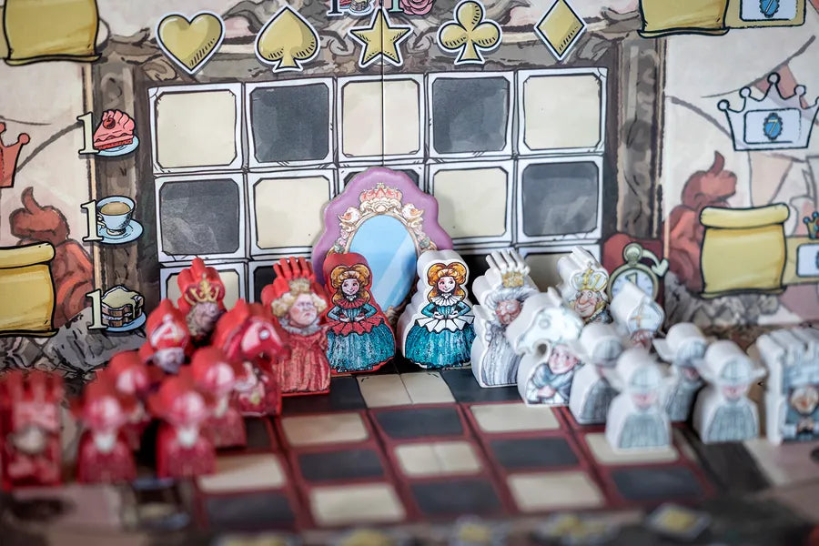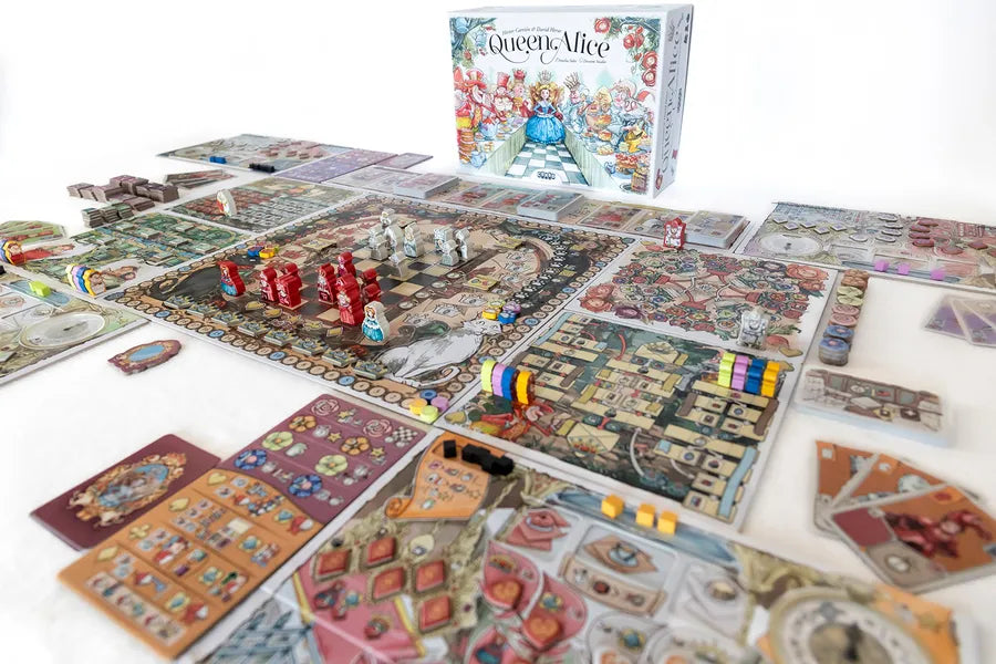 Queen Alice è un eurogame di peso medio-alto che ti trascina in un'avventura ispirata al mondo di Lewis Carroll, dove il destino del regno si decide attorno a un banchetto d'incoronazione. Quando Alice attraversa lo specchio richiamata da un misterioso messaggio, si ritrova in una terra che necessita di una nuova guida; come membro della "Corte dall'altra parte dello specchio", la tua missione sarà coordinare i preparativi per l'evento, convincendo i bizzarri pezzi degli scacchi ad aiutarti. Il tuo obiettivo finale in questo gioco da tavolo è diventare la figura più influente dell'era nascente, manipolando i fili del regno affinché Alice venga incoronata come Regina Bianca o Regina Rossa, a seconda di quale fazione favorisca maggiormente i tuoi interessi segreti.