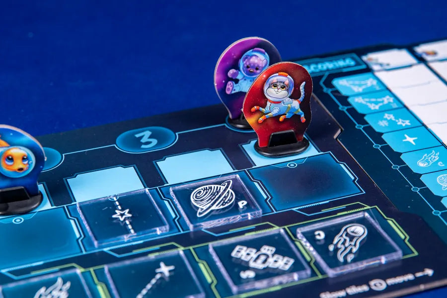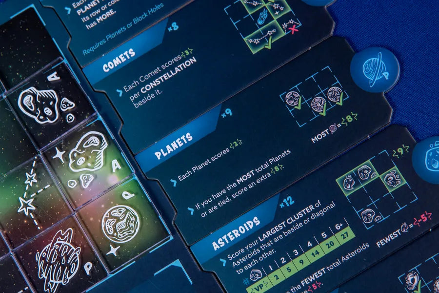 Le tessere sono dotate di un sistema di punteggio modulare che ti permette di creare la tua strategia: con 10 condizioni di punteggio nella scatola, puoi mescolarle per ottenere ben 32 diverse configurazioni di gioco. Costellazioni, asteroidi, comete, pianeti e buchi neri hanno tutti modi diversi di farti segnare punti. Chi trova il punteggio più alto tra le stelle vince la partita.