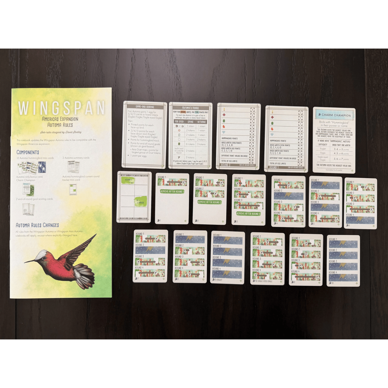 I componenti di Wingspan Americas includono 111 nuove carte uccello più 40 carte colibrì (con i relativi tabelloni e tappetini), 8 nuove carte obiettivo, 5 tessere obiettivo bifacciali e una modalità Automa in solitaria. Questa espansione richiede il gioco base Wingspan (o Wingspan Asia , che è un gioco autonomo per 1-2 giocatori).